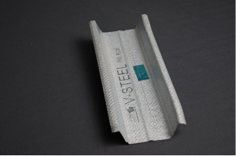 The ceiling section is made of 0.55 mm thick G.I. steel, featuring a knurled web of 51 mm, two flanges of 26 mm each, and 10.5 mm lips, with a 150-micron galvanized zinc alum [AZ] coating.