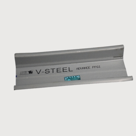 The ceiling section is made of 0.9mm thick G.I. steel, featuring a knurled web of 51mm, two flanges of 26mm each, and 10.5mm lips, with a 20-micron PPGI coating.