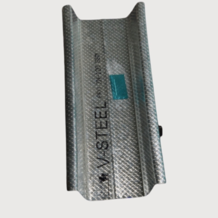 The ceiling section is made of 0.55 mm thick G.I. steel, featuring a knurled web of 51 mm, two flanges of 26 mm each, and 10.5 mm lips, with a 120-micron galvanized zinc coating.